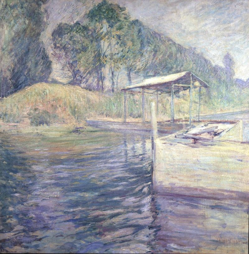 Reflections is somewhat unusual in the expansive quality of the composition, a feature strongly influenced by the site itself as well as by the French Impressionist works of Claude Monet, with which Twachtman was especially familiar from 1893 . . . . The receding river view, organized along a strong diagonal that is further accentuated by the line of tall trees lining the bank, is countered by the sharply foreshortened form of the angular pier. The compositional similarity to Monet is attributable in part to the interest of both men in the aesthetic of Japanese prints. . . . Here the Japanese influence is visible in the sweeping compositional lines and square format of the canvas, a device often employed by Monet and used from an early date by Twachtman, additionally encourages the reading of the canvas a two-dimensional design. Twachtman’s brushwork in this canvas is particularly reminiscent of Monet’s. As the title Reflections suggests, Twachtman was especially interested in the description of the watery foreground, where he suggested the reflections through a juxtaposition of broadly applied purple, blue, green, and yellow tones. Throughout the canvas, the lively brushwork conforms to the shapes of the pictorial elements. The overall result is a sense of visual vibration that is a departure from Twachtman’s customarily muted, evocative effects.