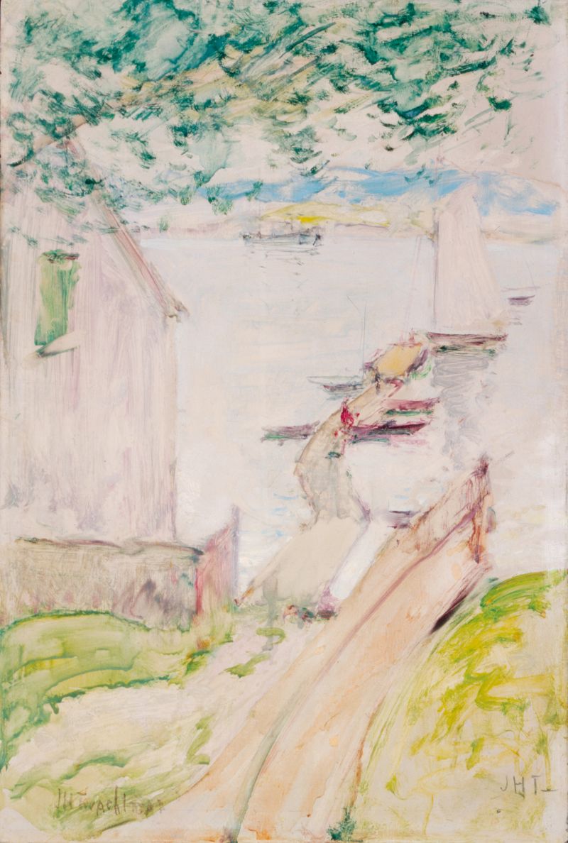 Twachtman portrayed this painting in one of the charcoal sketches he sent to his son Alden, recording the work he created in the summer of 1900 (D.1405). On the verso of the sketch, he wrote “12 x 18” and “after your pen sketch,” suggesting that Alden had also made an image of this subject earlier in the summer. The painting was included in three of Twachtman’s 1901 exhibitions (Chicago, New York, and Cincinnati). The New York Times reviewer referenced it in the comment: “Views of Gloucester, Mass., sparkle with distant waves and shine with colors on houses and ships as do ‘Captain Bickford’s Float,’ and ‘East Gloucester [probably OP.1406],’ and ‘White Dories [OP.1410].’”