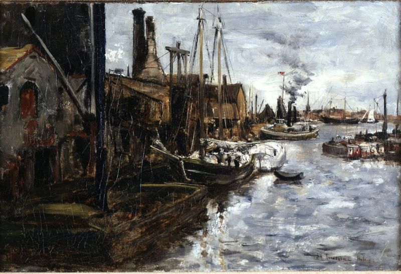 In this scene, Twachtman captured the bustle of New York's industrialized waterfront in the late 1870s. His view in the work, at the level of the pier, draws the viewer's eye on the rapidly receding diagonal, cluttered with warehouses, cranes, smokestacks, and barges, into the distance. The artist placed an American flag at the vanishing point, around which smoke swirls from a tugboat, as if to label the scene and its energy as distinctively American. At the right edge of the composition, the form extending into the harbor is perhaps one of New York's floating garbage dumps, some of which were large enough to be divided into rooms where indigents lived and from which they sold retrieved items.