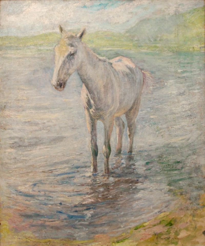 The Twachtman family owned a horse or horses during their years in Greenwich, as is documented in tax assessments. This white or gray horse is probably one that belonged to them. Twachtman captured it in a quiet moment on a hot summer day, its hooves in the shallow water of a pond—probably Horseneck Pond in Greenwich to the south of his home.