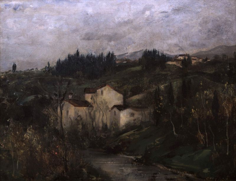 This painting is a view of the Valley of the Mugnone, to the south of Fiesole, Italy. As in Florence, Italy, near Fiesole (OP.400) and Tuscan Scene (OP.401), it depicts the narrow Mugnone River, a tributary of the Arno. Twachtman's visit to this site occurred in 1880–81, when he taught at the school formed by Frank Duveneck in the hills above Florence. Here he captured a cultivated landscape where small communities, stands of cypress trees, and winding paths were at graceul intervals across the undulating hills, with a view of the Apenine mountains in the distance.