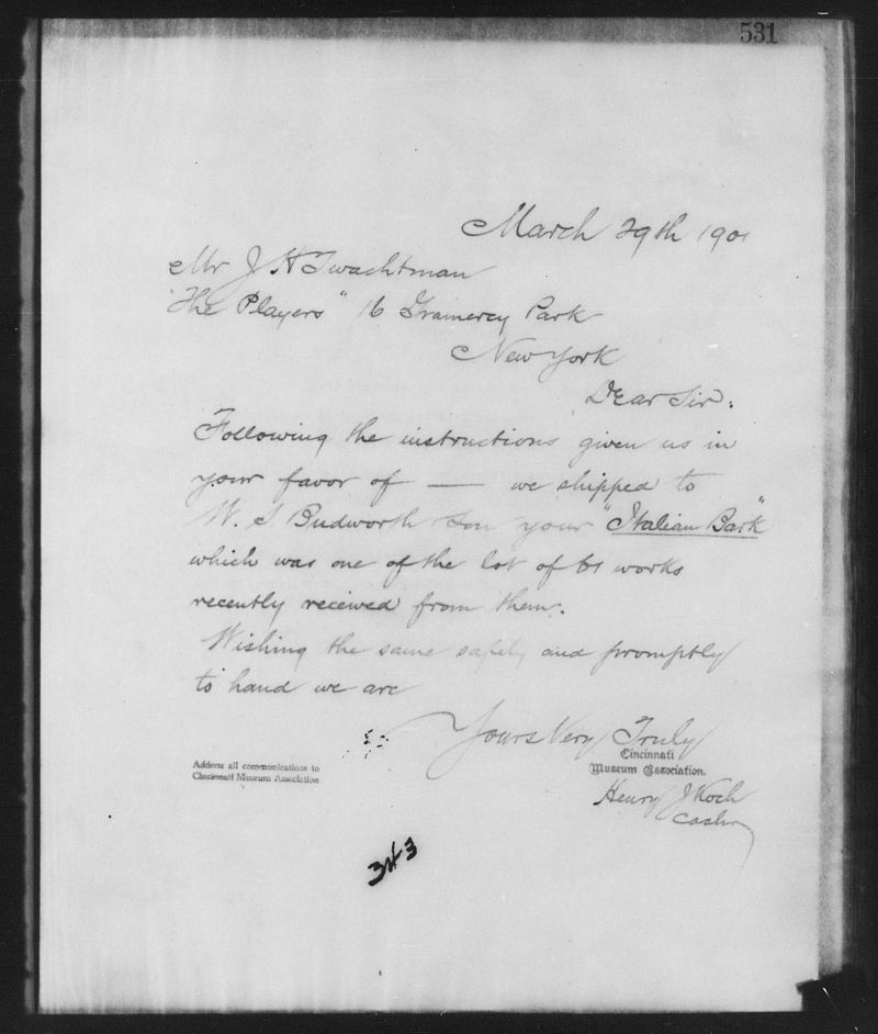 Henry J. Koch, Cincinnati, to John H. Twachtman, New York, March 20, 1901, Mary R. Schiff Library & Archives, Cincinnati Art Museum